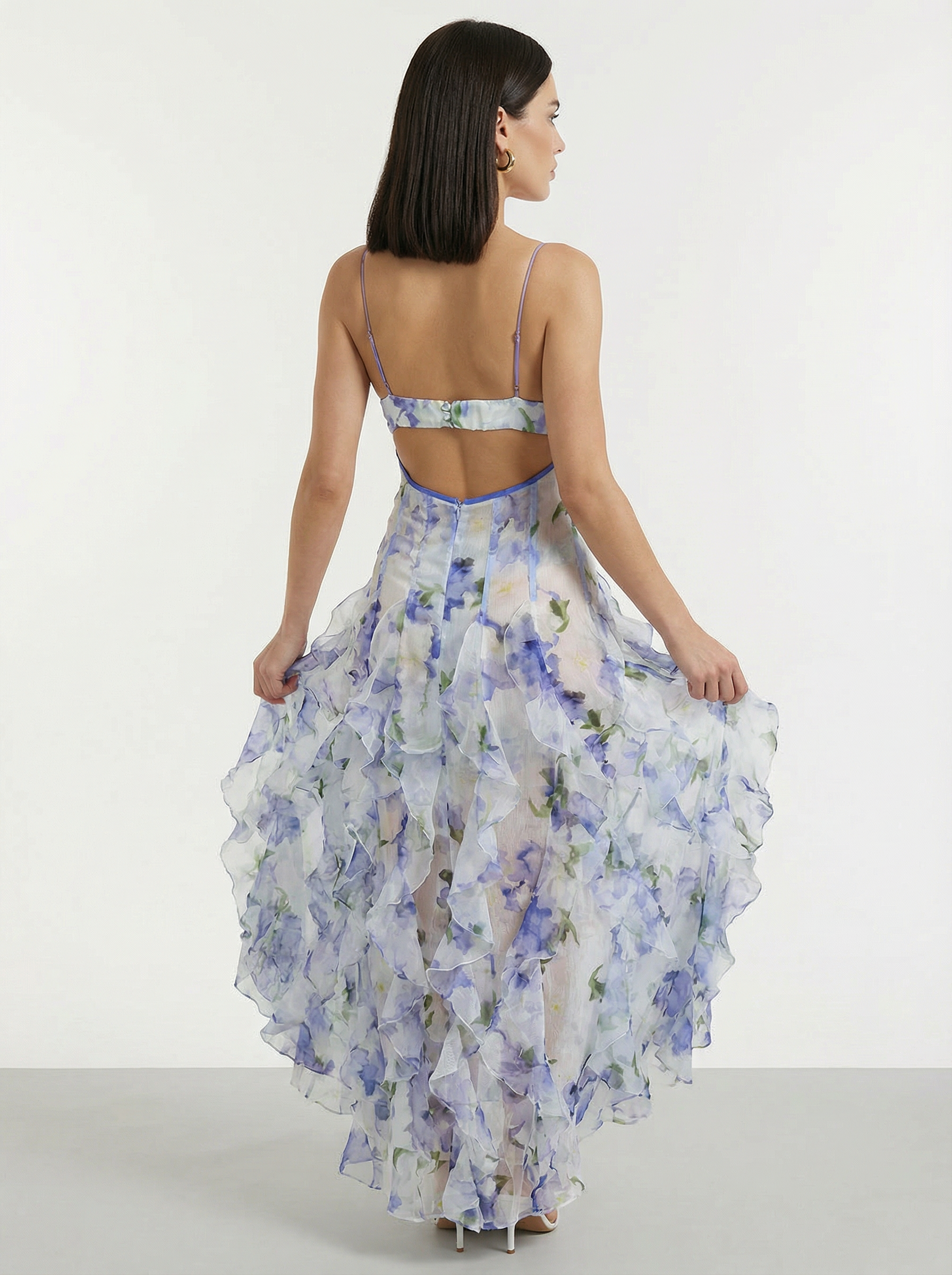 Das Kleid zeichnet sich durch ein tailliertes Mieder mit Raffungen aus, das in einen bodenlangen Rock mit kaskadierenden Volants übergeht. Das blau-weiße Blumenmuster verleiht dem Kleid eine frische und raffinierte Ästhetik, ideal für Sommerabende oder besondere Anlässe im Freien.