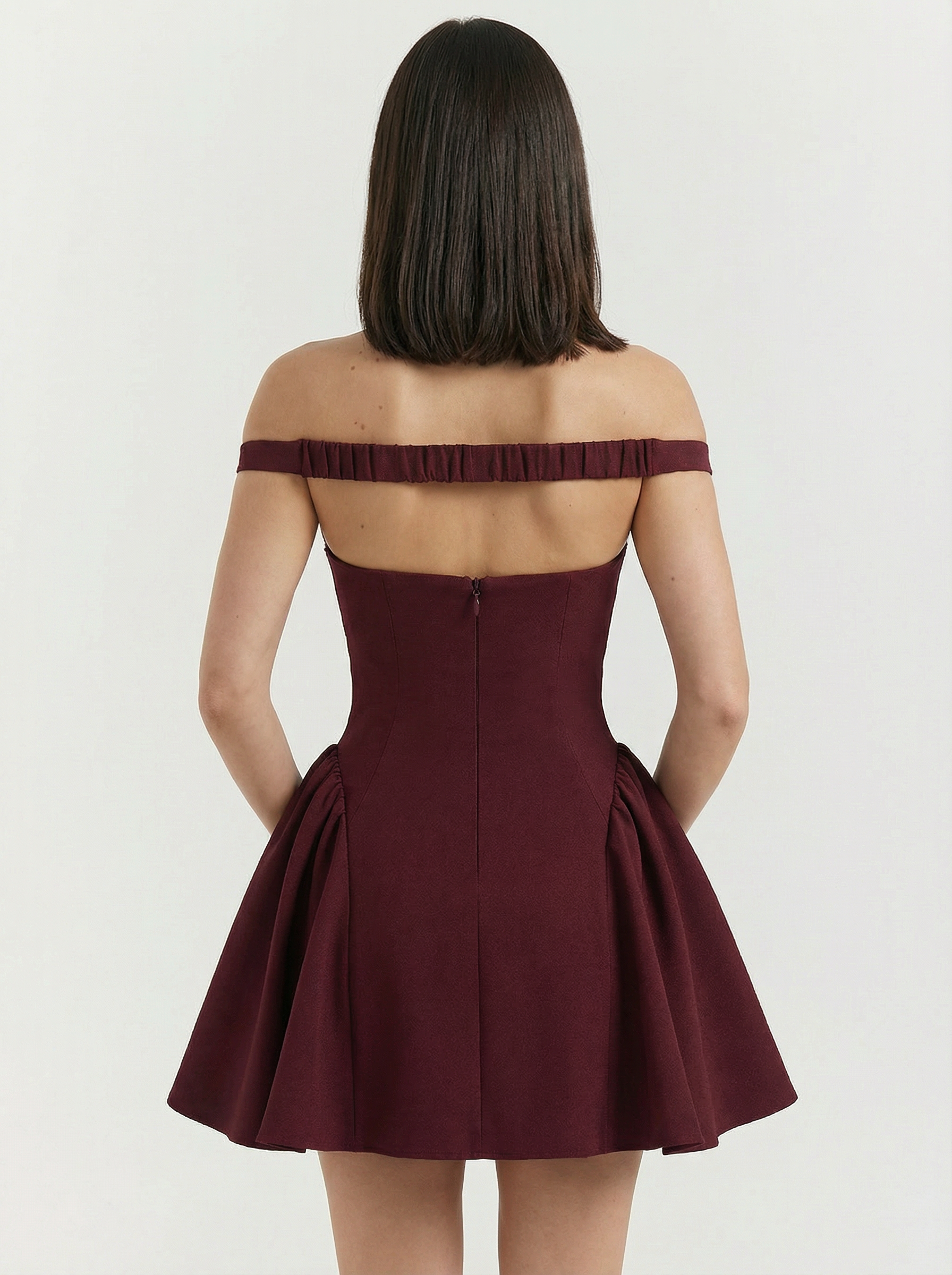 Das Iris Minikleid ist ein strukturiertes Abendkleid mit schulterfreiem Ausschnitt und einer klar definierten Silhouette. Das Design setzt auf eine Kombination aus einer körpernahen Passform und architektonischen Details, passend für semi-formelle bis formelle Anlässe.